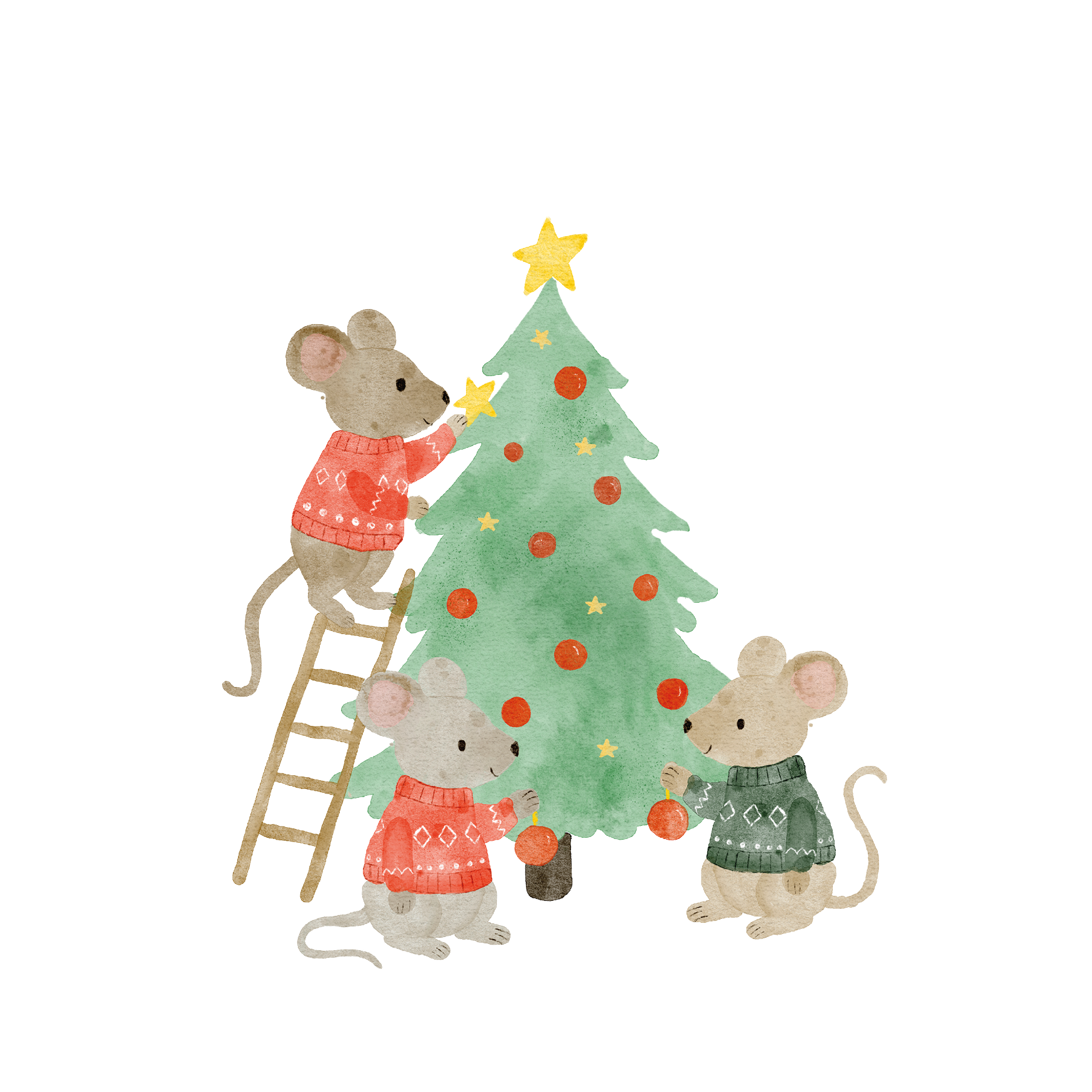 Motiv: Mehrere kleine Mäuse, die einen geschmückten Weihnachtsbaum verzieren
