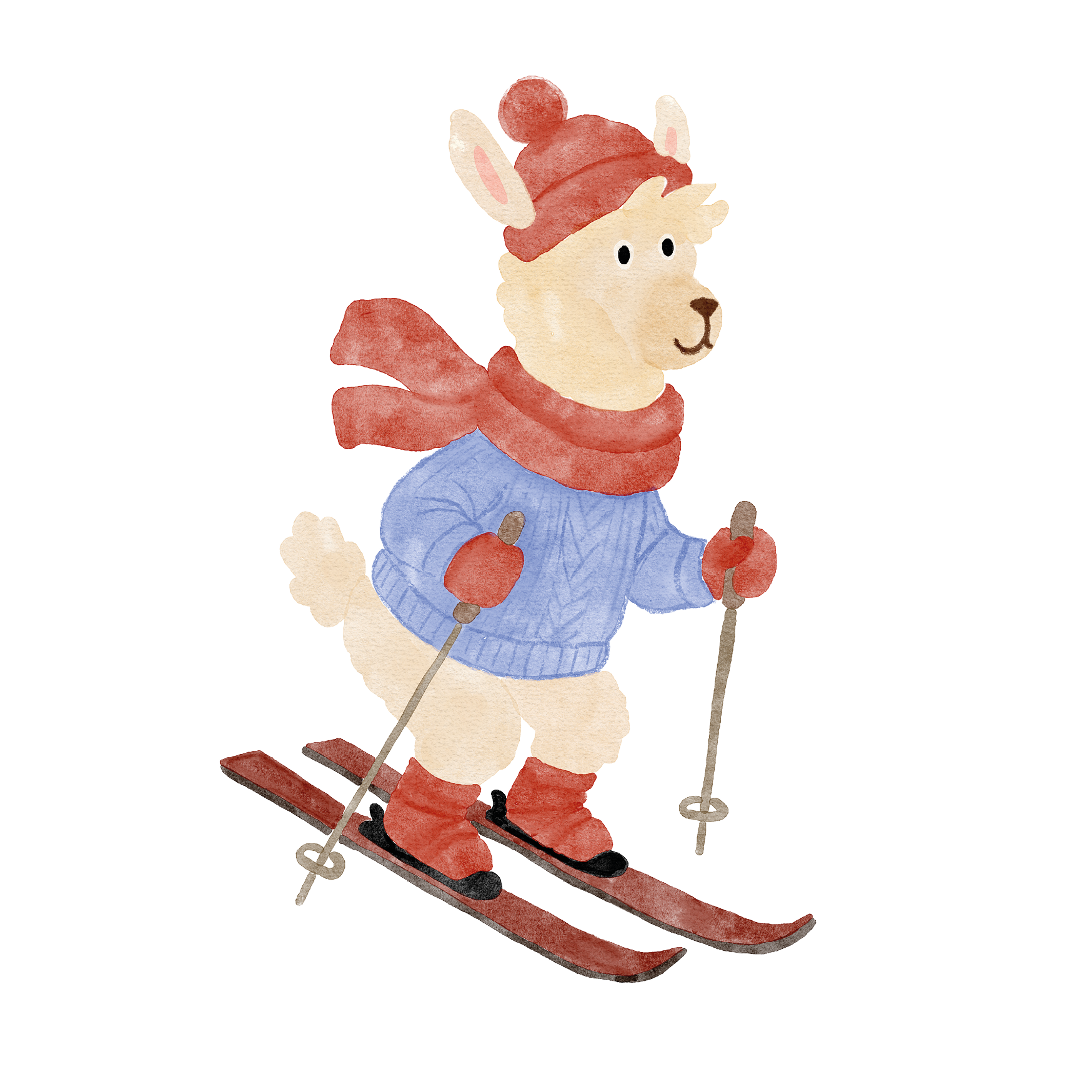 Dieses liebevoll illustrierte Motiv zeigt ein fröhliches Lama mit Schal und Mütze, das vergnügt auf Skiern durch den Schnee fährt – ein echter Hingucker für kleine und große Winterfans.