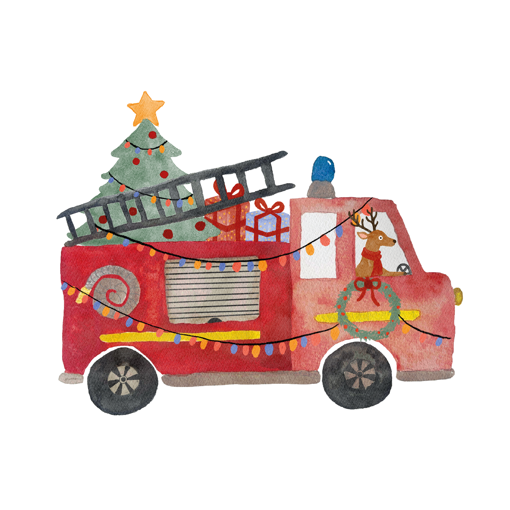 Motiv: Weihnachtliche Feuerwehr mit Geschenken, Lichtern und festlicher Deko