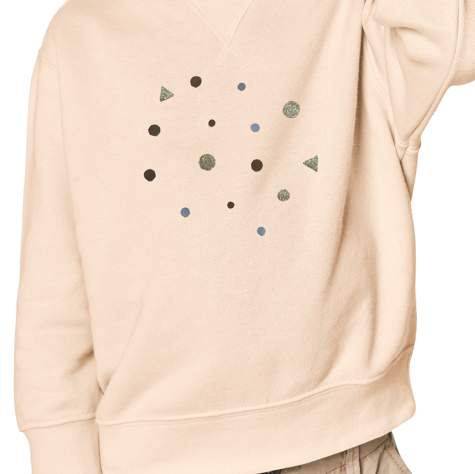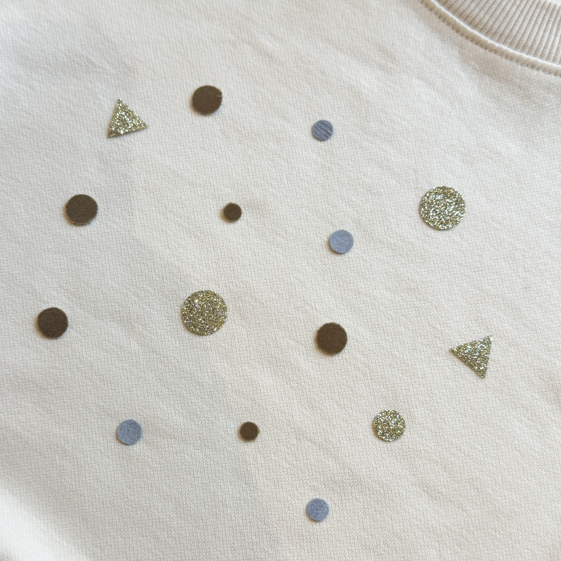 Mit leichtem Druck etwa 15 Sekunden lang über das Backpapier bügeln. Achte darauf, dass keine Elemente verrutschen. Anschließend das Kleidungsstück auf links drehen und nochmals von der Rückseite bügeln, um das Konfetti endgültig zu fixieren.