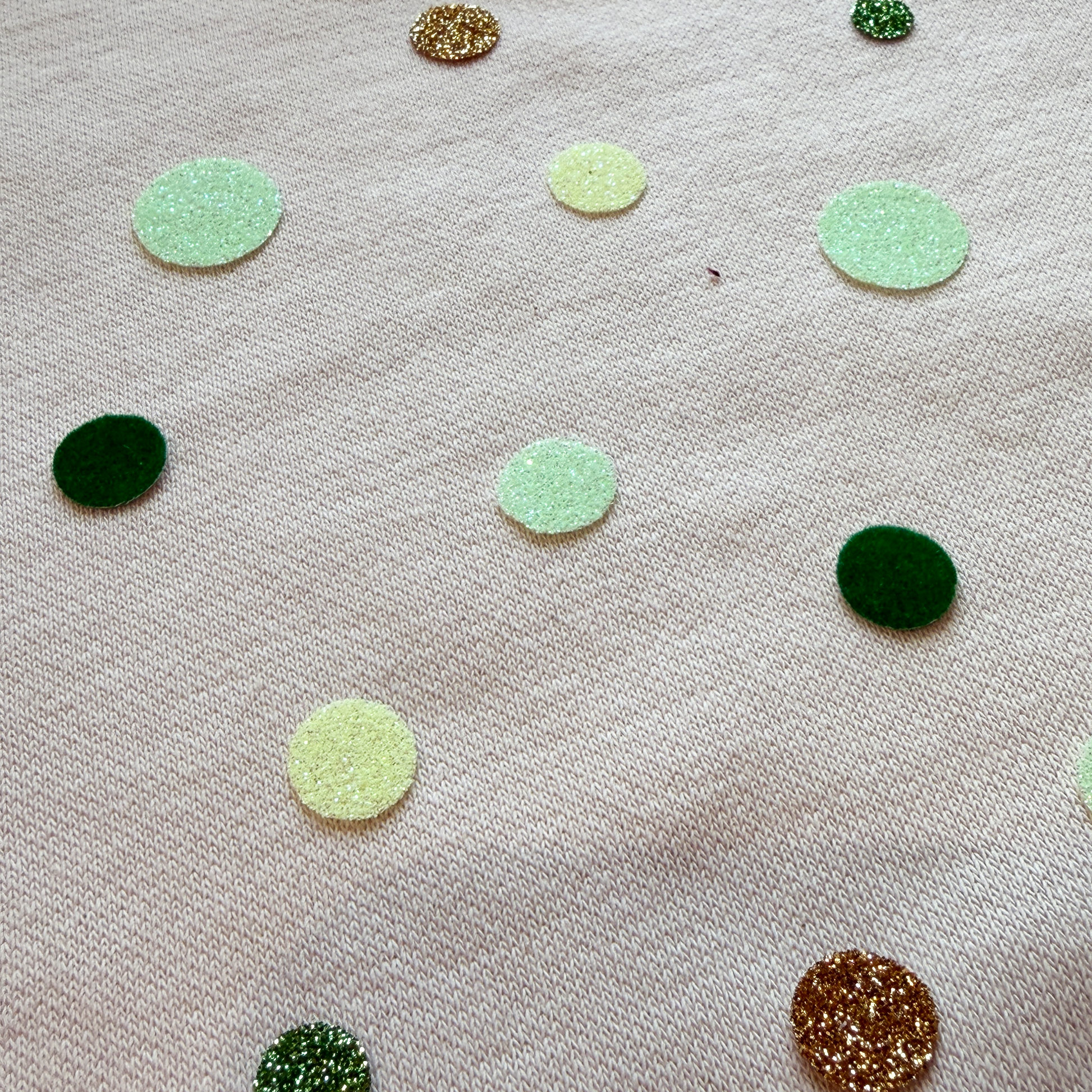 Mit leichtem Druck etwa 15 Sekunden lang über das Backpapier bügeln. Achte darauf, dass keine Elemente verrutschen. Anschließend das Kleidungsstück auf links drehen und nochmals von der Rückseite bügeln, um das Konfetti endgültig zu fixieren.