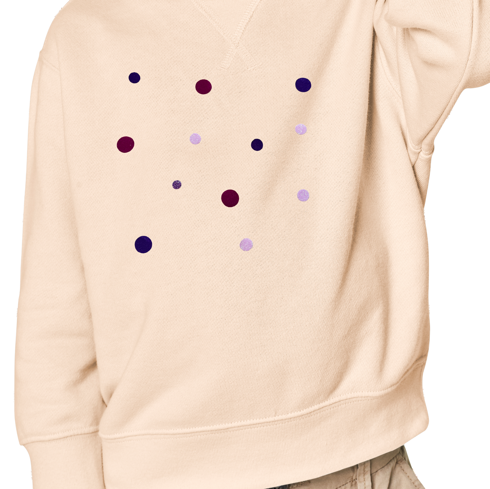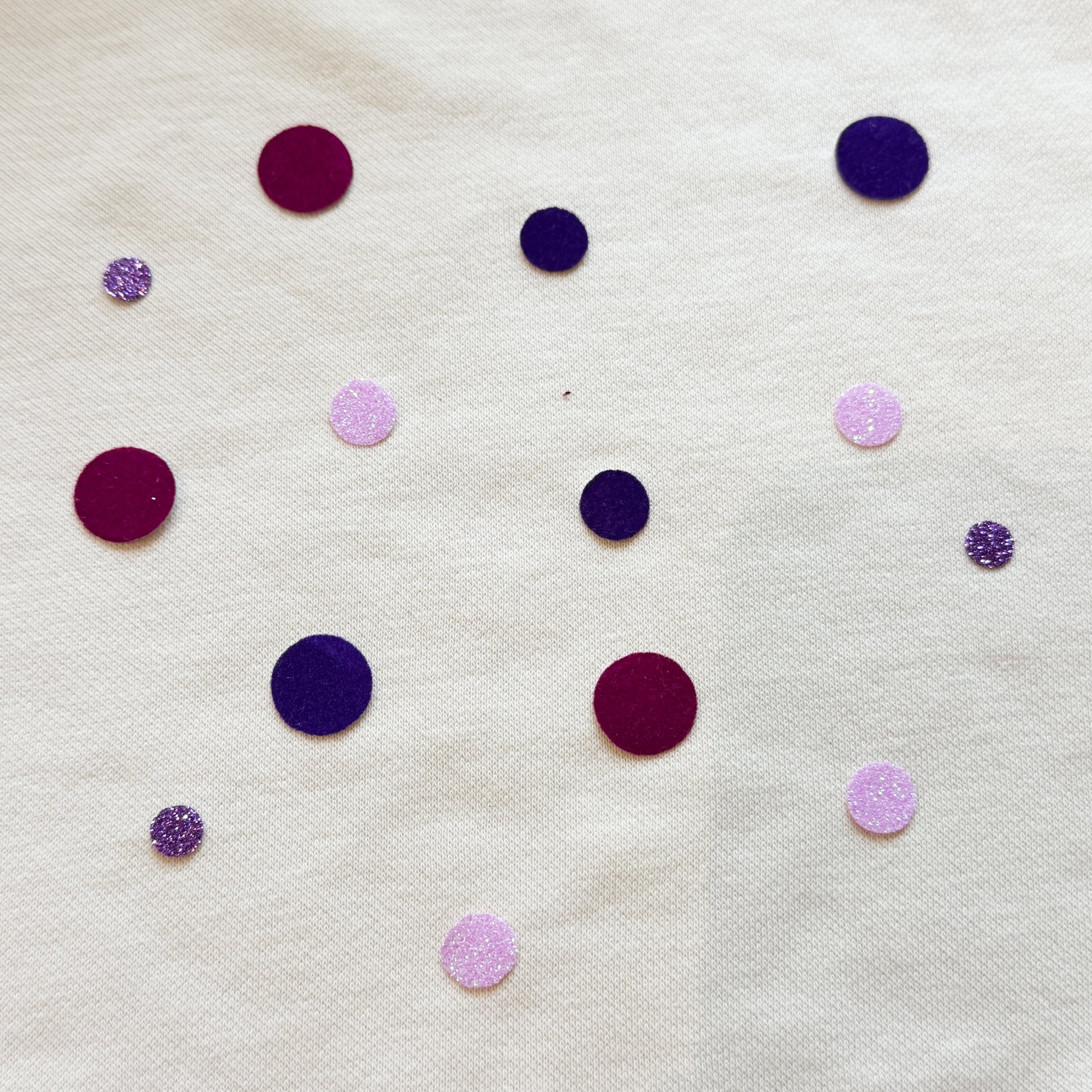 Mit leichtem Druck etwa 15 Sekunden lang über das Backpapier bügeln. Achte darauf, dass keine Elemente verrutschen. Anschließend das Kleidungsstück auf links drehen und nochmals von der Rückseite bügeln, um das Konfetti endgültig zu fixieren.
