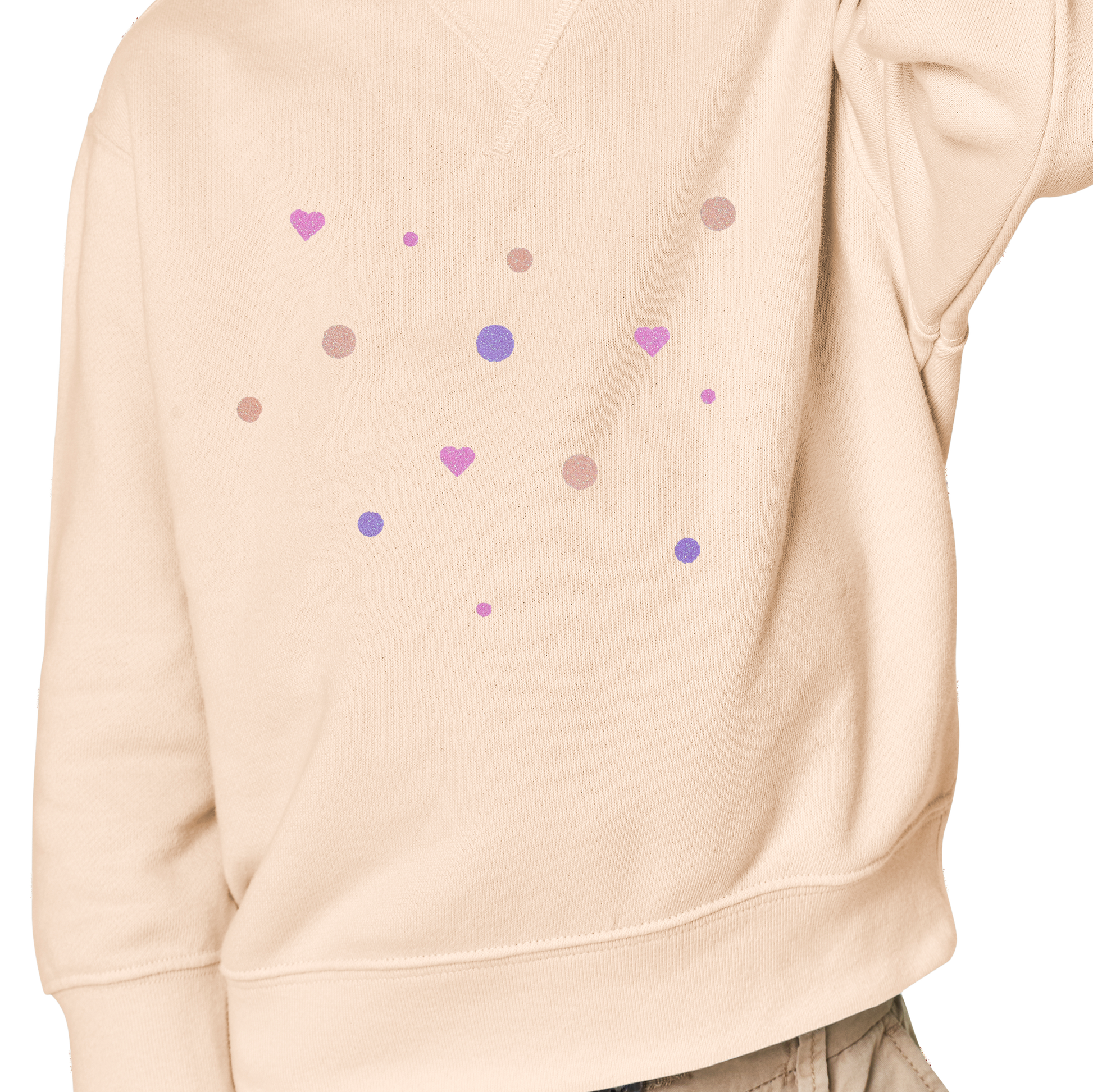 Mit leichtem Druck etwa 15 Sekunden lang über das Backpapier bügeln. Achte darauf, dass keine Elemente verrutschen. Anschließend das Kleidungsstück auf links drehen und nochmals von der Rückseite bügeln, um das Konfetti endgültig zu fixieren.