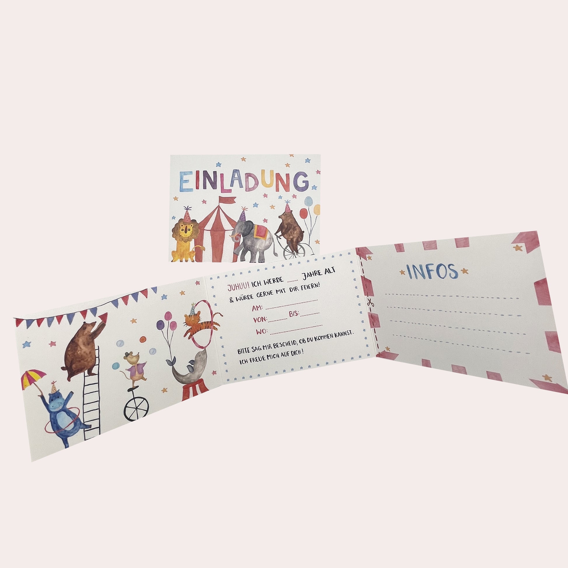 Diese liebevoll gestalteten Einladungskarten im fröhlichen Zirkus-Design machen den Kindergeburtstag schon vor der Feier zu einem besonderen Erlebnis. Mit bunten Illustrationen von Zirkuszelten, Clowns und Artisten begeistern sie kleine und große Gäste gleichermaßen.