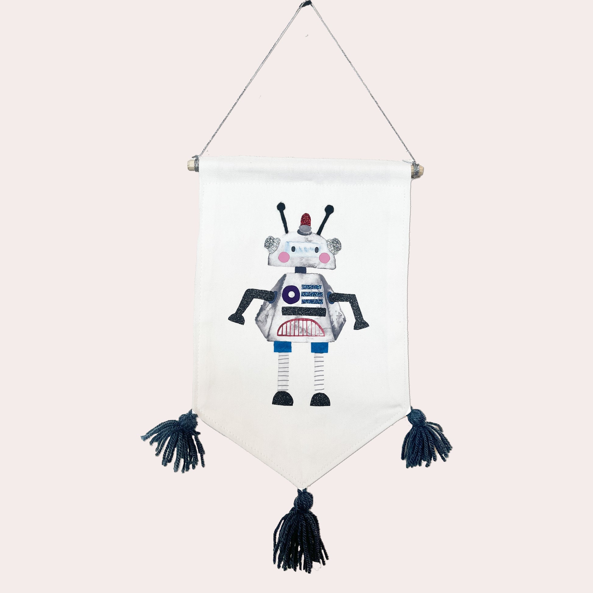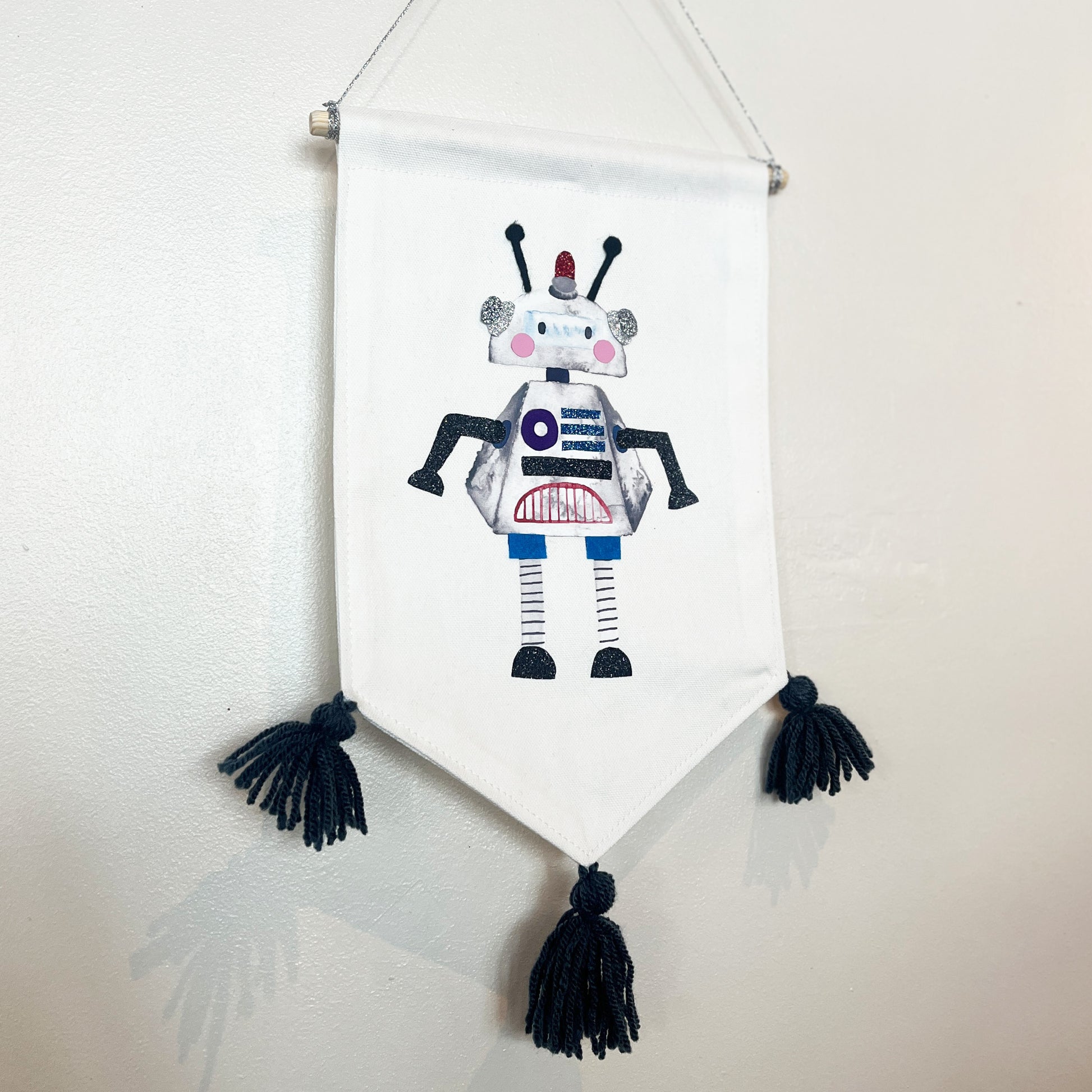 Bringe mit diesem handgefertigten Roboter-Wimpel eine futuristische und kreative Atmosphäre ins Kinderzimmer!